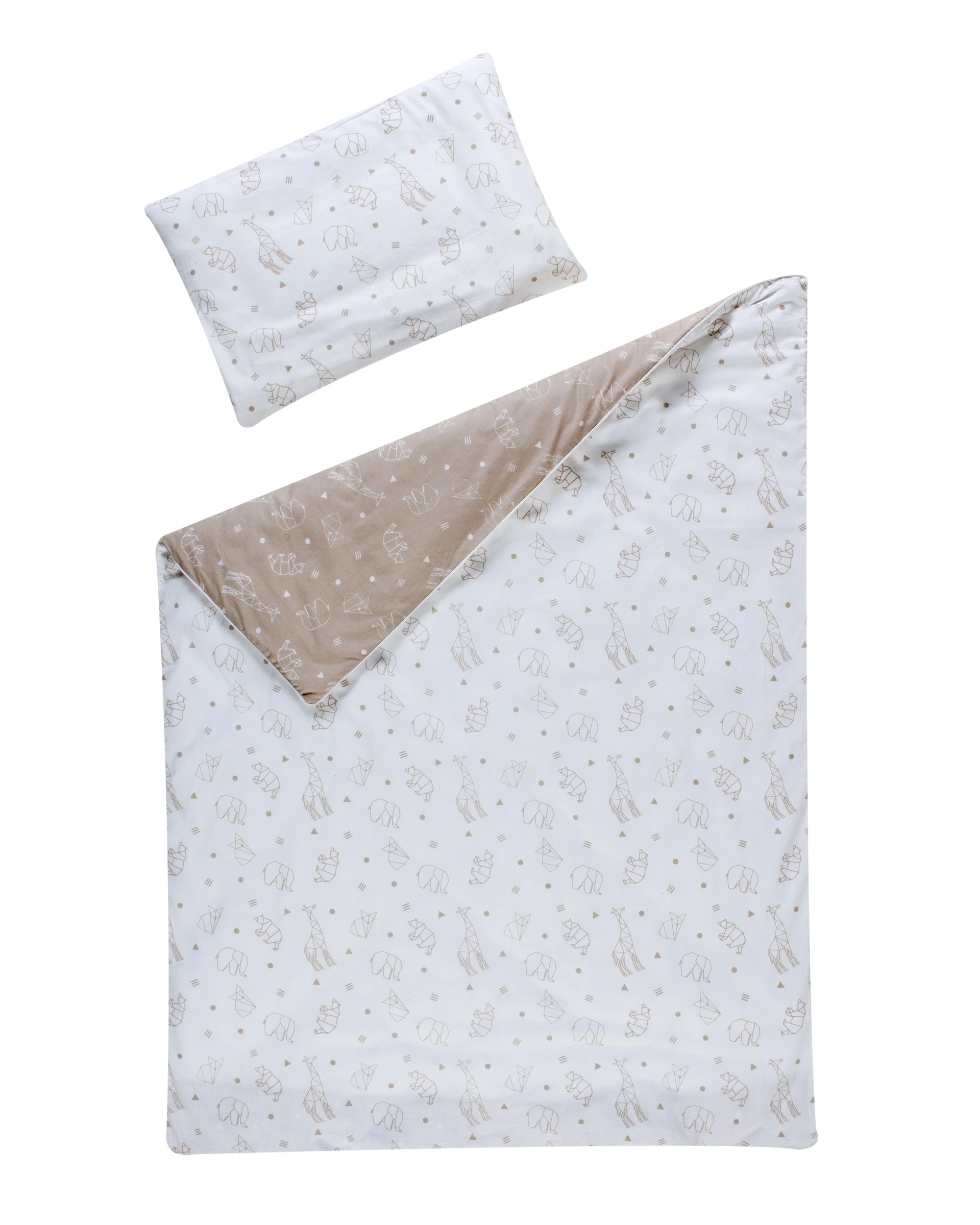 Mit den liebevoll ausgewählten Textilien von Schardt können Sie jedes Kinderzimmer individuell, harmonisch abrunden. Kinderbettausstattungen von Schardt gibt es in einer Vielzahl unterschiedlichster Designs. Das 4-teilige kuschelige Bettset “Origami Beige” besteht aus einem Himmel, einer 2-teiligen Bettwäsche und einem Nestchen. Die 2-teilige Bettwäsche besteht aus einem Kissen Gr. 40 x 60 cm und einer Zudecke Gr. 100 x 135 cm. Für den praktischen Gebrauch im Alltag dient der sogenannte Hotelverschluss dieser textilen Ausstattung. Kuschelige Geborgenheit von der ersten Stunde an wird durch den Einsatz von pflegeleichten Baumwollstoffen geschaffen, die bei 30° Grad waschbar sind. Trockner geeignet.