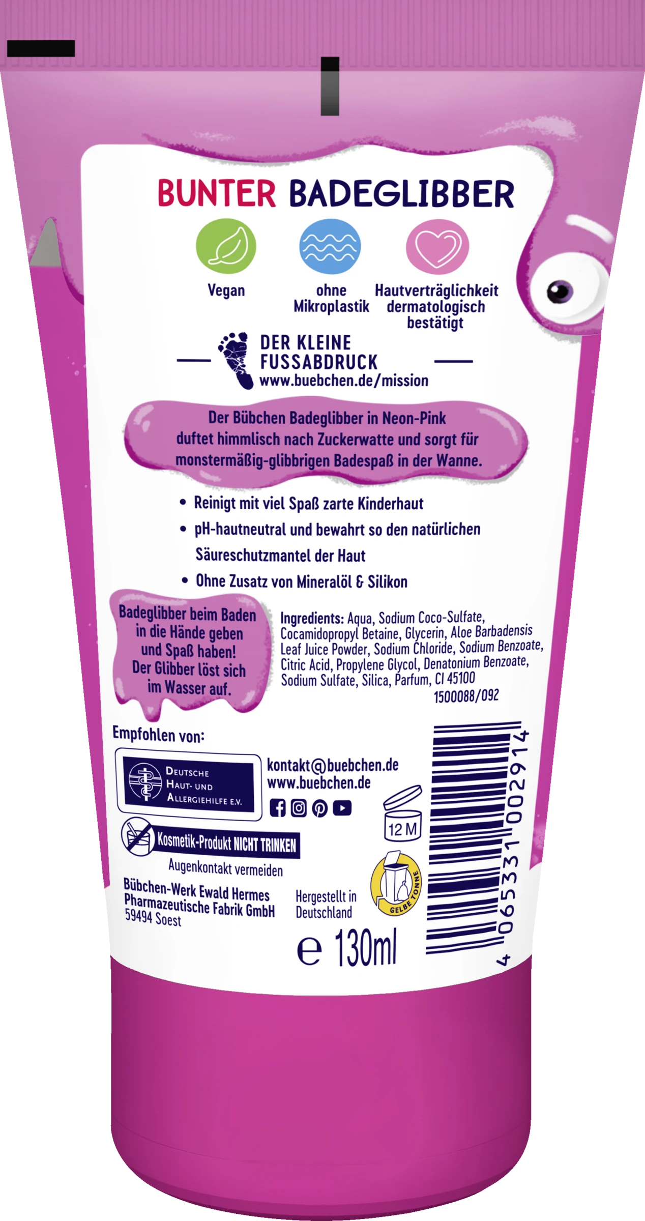 Baden, Spielen, Kleben – Der Bübchen Badeglibber in Neon-Pink duftet himmlisch nach Zuckerwatte und sorgt für monstermäßig-glibbrigen Spaß in der Badewanne. Dank der milden Inhaltsstoffe und durch die Verwendung von Aloe vera reinigt der Badeglibber sanft die zarte Kinderhaut.