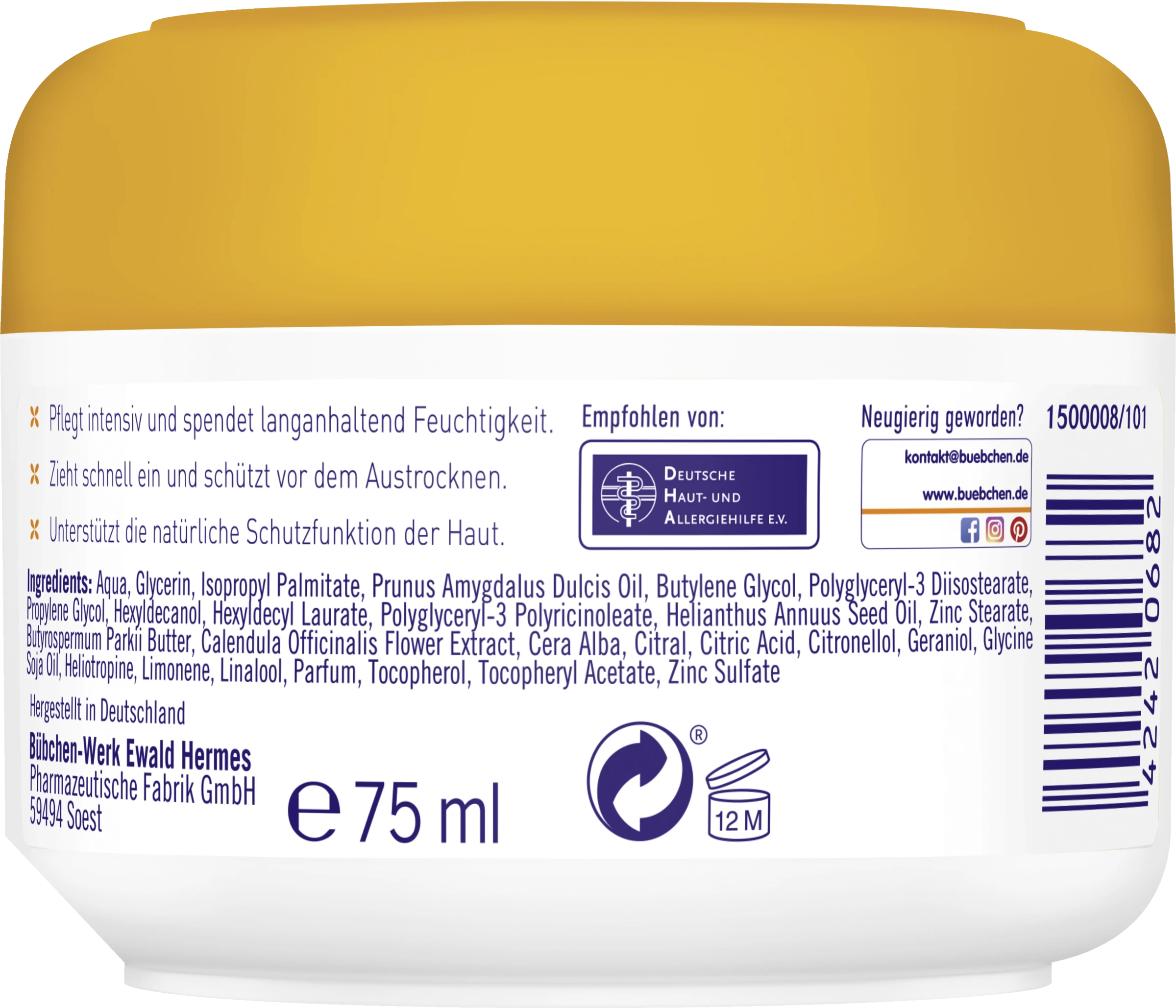Bübchen Calendula verwendet ausschließlich zertifizierte BIO-Calendula aus kontrolliertem Anbau. Dank der entzündungshemmenden Eigenschaften der Calendula eignen sich die Produkte besonders für die Pflege der zarten und trockenen Babyhaut. Diese milde Spezialpflege beruhigt und hilft empfindlicher Haut dabei, widerstandsfähiger zu werden.