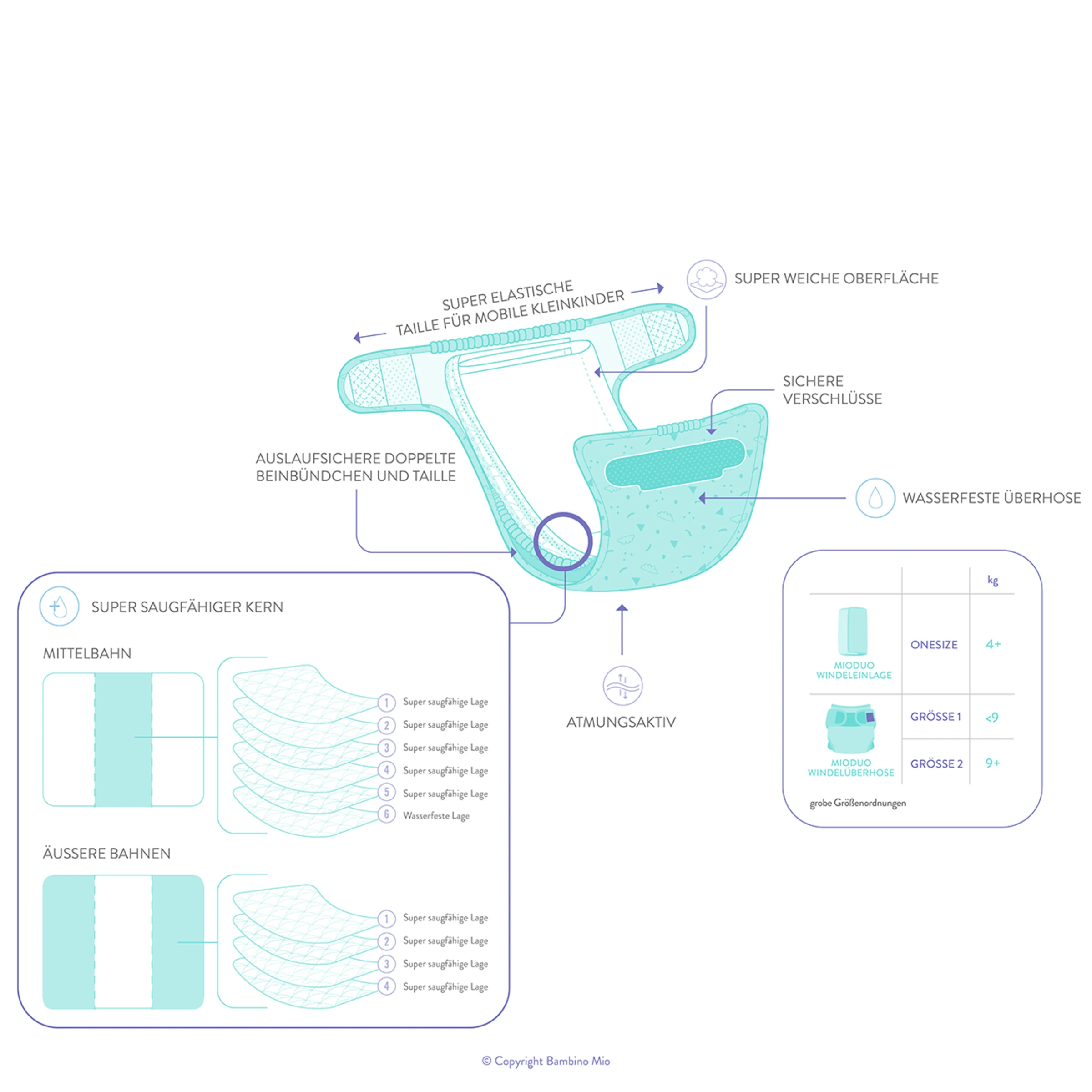 Die mioduo wasserfeste Windelüberhose von Bambino Mio kann in Kombination mit jeglichen Stoffwindeleinlagen verwendet werden. Verfügbar in zwei Größen und vom Baby- bis ins Kleinkindalter geeignet.